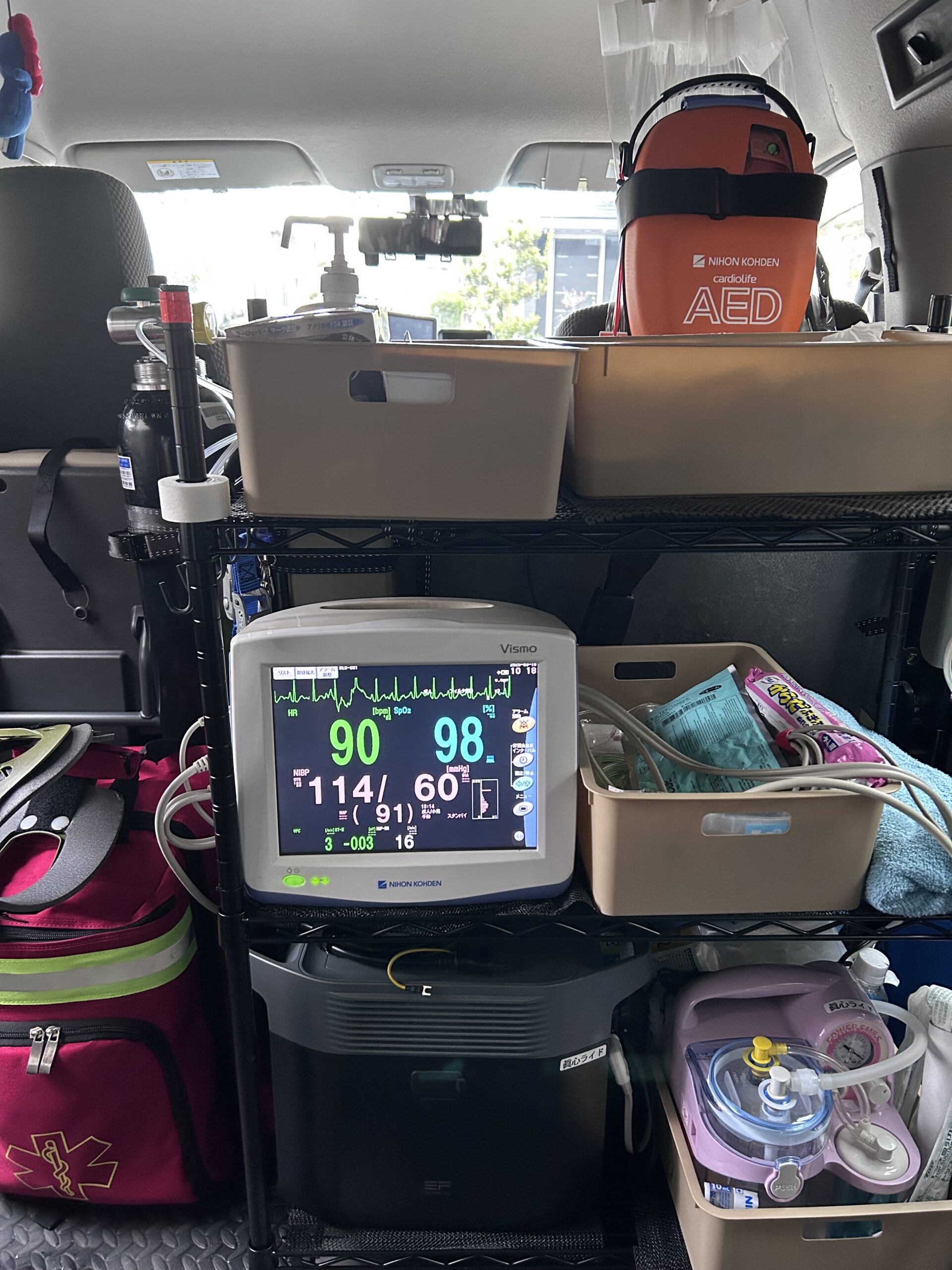 生体モニターを搭載し、搬送中も心拍数・酸素飽和度などを継続的に観察します。