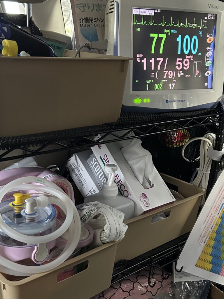 搬送中の「もしも」に備え、以下の医療機器を車内に常備しています。